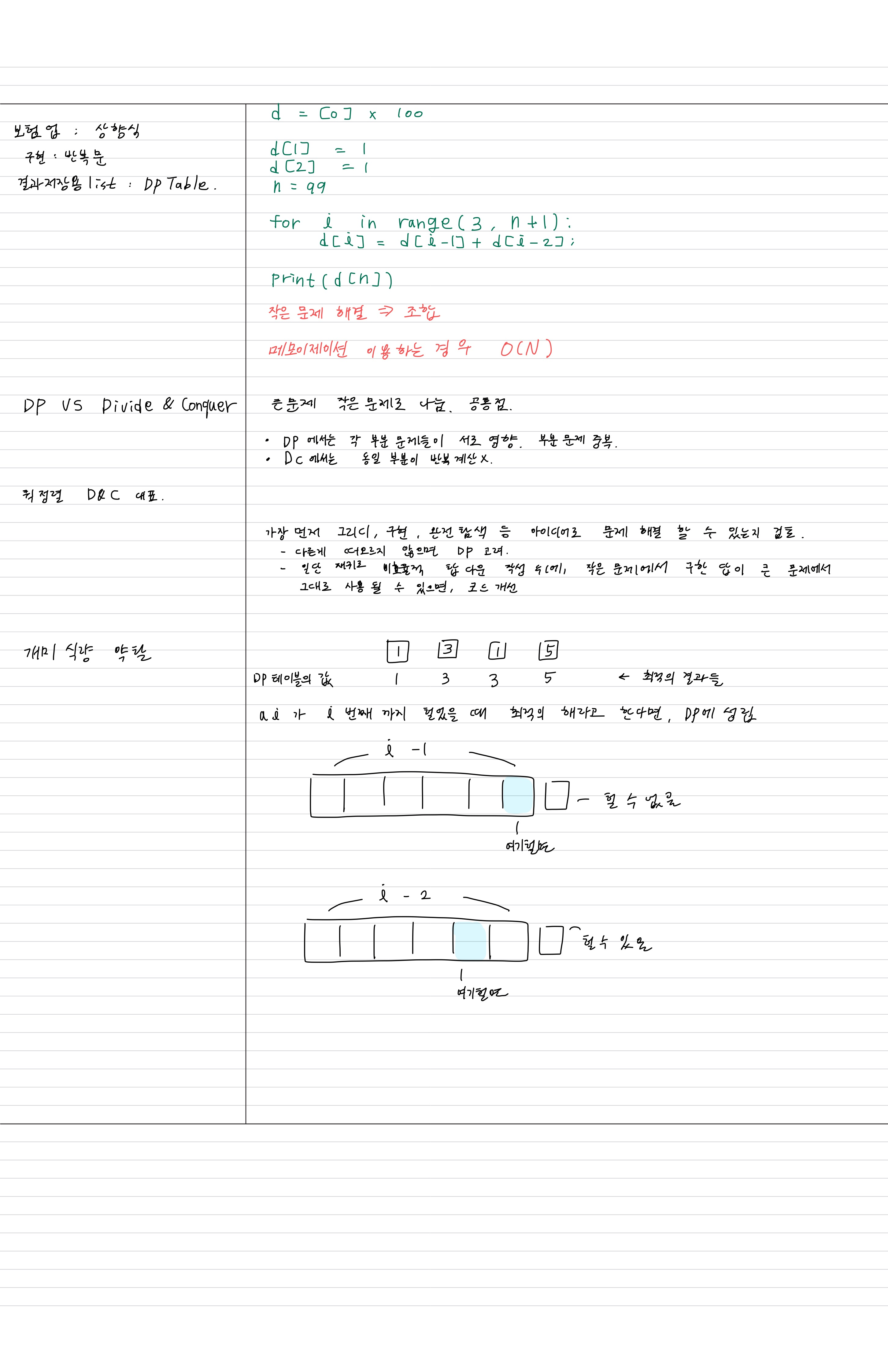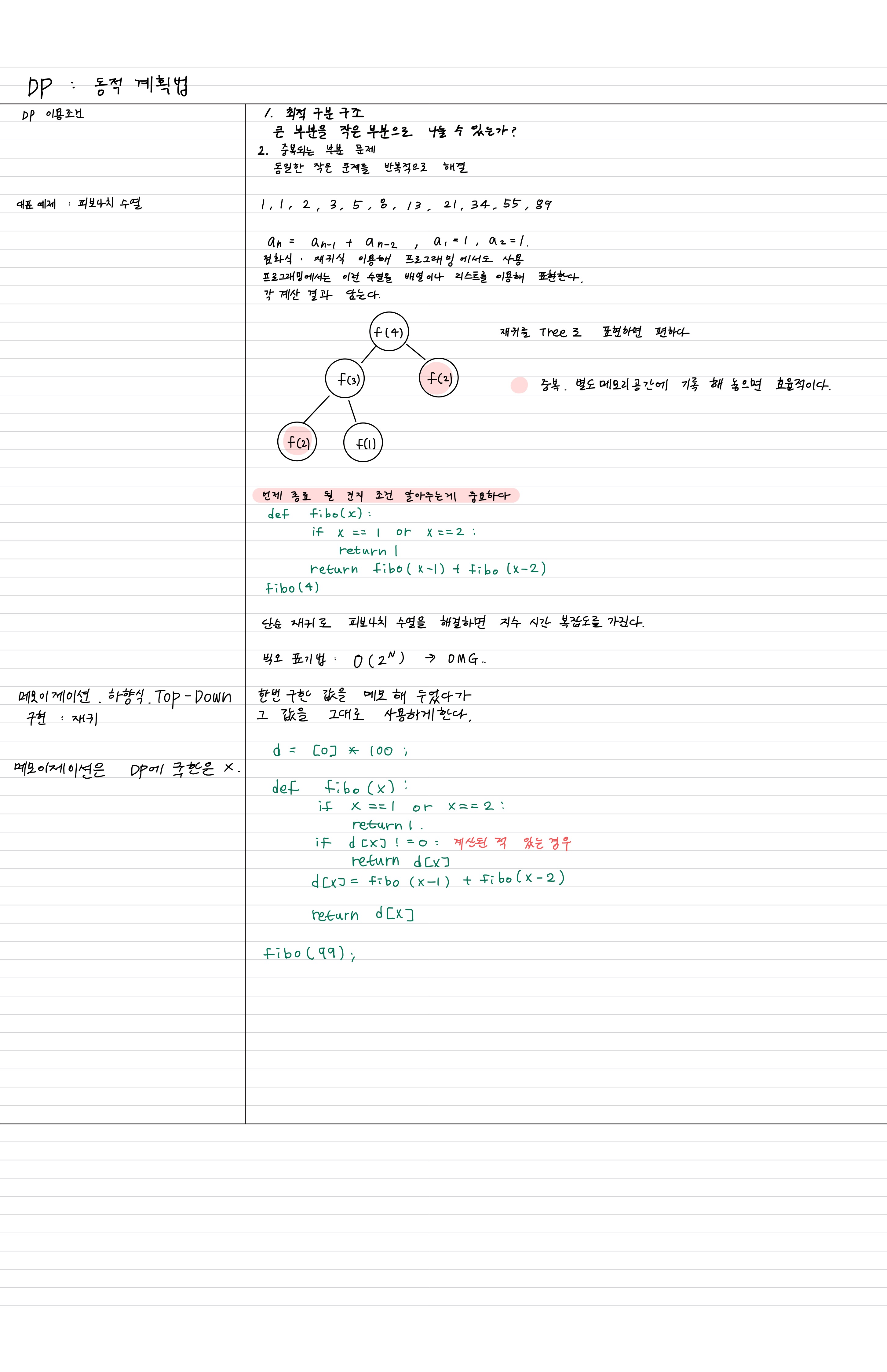 유튜브의 나동빈강의를 듣고 필기하며 정리 해 봤다. 최대한 다른 방법들을 우선적으로 생각하고 DP 를 적용 할 생각은 나중에 하는 것이 좋다. 강의 뒷 부분 예제 문제부터는 너무 어려워서 이해하지 못했다... ^^